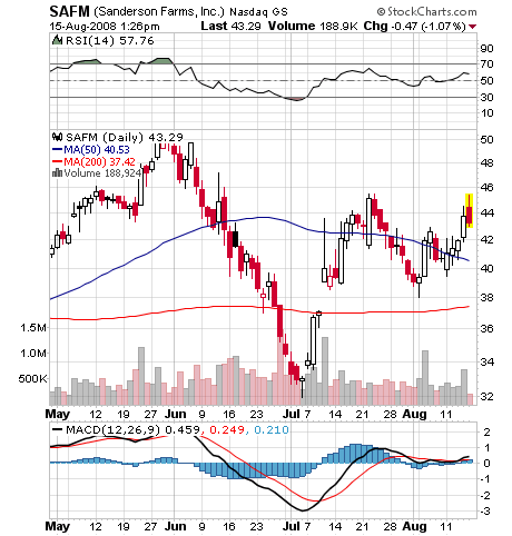 I took a small 1/4 size pilot position in SAFM today, buying 100 shares at $43.29. This stock was highlighted in the trade report, with a buypoint in the $42-34 range.