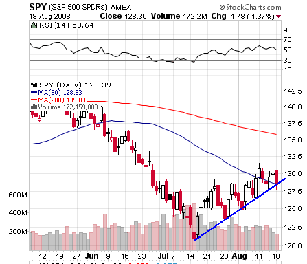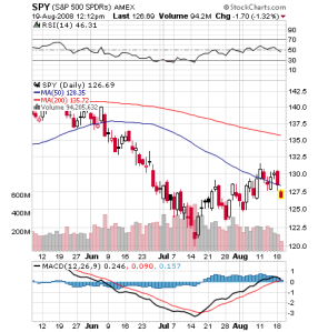 Last Monday (August 12th) I took a small SPY short position based on a “failed breakout” scenario, above $131 (I actually used SDS–the inverse ETF). It’s now trading at $126.69. Below is what I wrote to my trade report members. It explains not only the setup, but the thought process and trade management strategy that went into the trade: