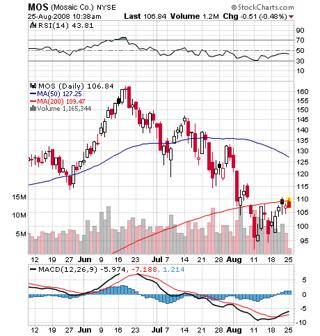 I went short 400 shares of MOS at $109.11. I highlighted this stock in the blog last night as one of my favorite commidity related shorts. See my last post for the setup. My stop is around $115 with my initial target at $95. This is where I would take partial profits, move my stop up, and let the rest “ride”.