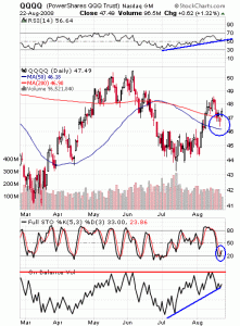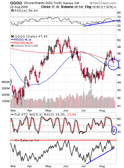 There is less confusion in the Qs than SPY. The July accumulation zone was marked by strong volume and positive divergences in RSI and stochastics (we noticed back then and traded it). Q then raced higher and mounted both moving averages before pullback back to support. Thursday it printed a hammer tail at support, which was confirmed on Friday. The pullback created an oversold stochastic that is turned up. This is the type of healthy price movement we want to see in a long setup. I may enter tomorrow.