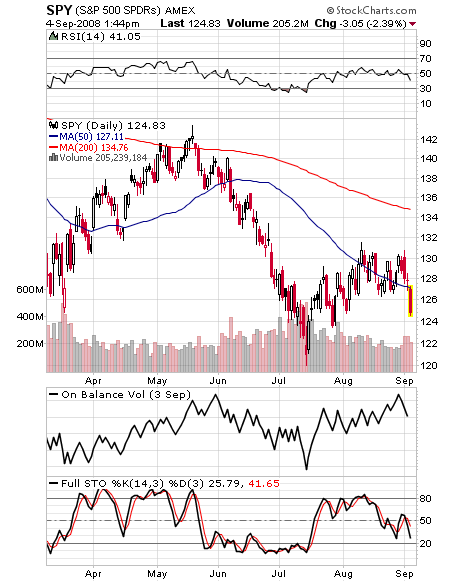 On August 12th I went short SPY around $131 (actually used SDS) based on the “failed breakout scenario” I noted in the trade report. While it’s been a bumpy ride, the trade is really starting to take off now. This is a good example of how important it is not to pull out of a trade before a support/resistance based stop is hit.
