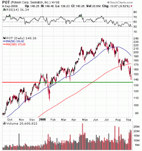 I was stopped out of my three commodity bounce positions for two small losses (X and NOV) and one overall gain (POT). Since getting stopped out early in the morning, almost all commodity stocks took a big dip lower. Thus, I am looking to enter again using the “rubber band” bounce setup.