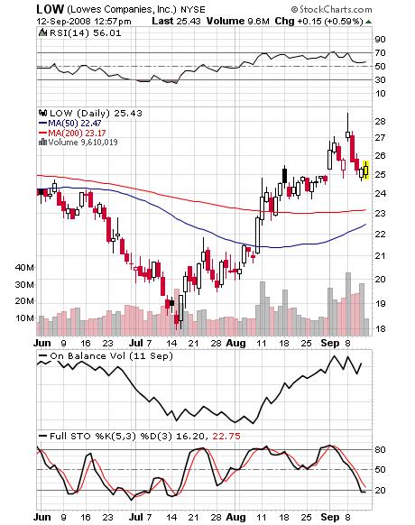 Retail stocks are nearing my entry levels. However, the negative retail report could pull them down further. For this reason, I am taking small position sizes in my retail trades and using tight stops–KSS, ARO and LOW.