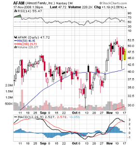 APOL and AFAM. Both have been on the focus list of the Trade Report since last week. I had buy stops in place near support and just exited half the positions. Stops have been moved up to entry level.