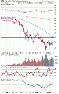 While I’m bullish on the market, my preference to enter long trades at extreme oversold conditions is keeping me from entry at these levels. I’ll buy SSO on a pullback that works off the close to overbought conditions. However, I will also short the S&P 500 via SDS once it nears the 50 day moving average. This would be a very short term trade.
