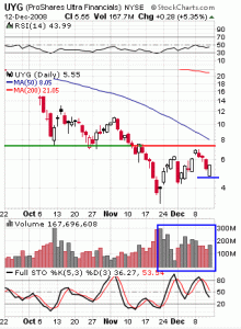 A nice bottom pattern is forming in financial stocks and the leveraged ETF UYG. Trade management is made easy with a stop placed below Friday’s close and the target near the recent high. I may be tomorrow on weakness.