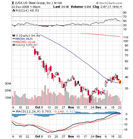 X provides a low risk setup as it pulls back to the 50 day moving average. If the market tanks, X will go down with it, but losses are easily managed at this level.