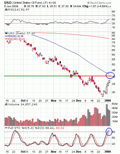 I exited both of my oil trades today for nice gains. Whereas my entries were based on an extremely oversold oil market, today’s exits were based on overbought readings. Price is nearing resistance levels while stochastics are nearing extreme levels.