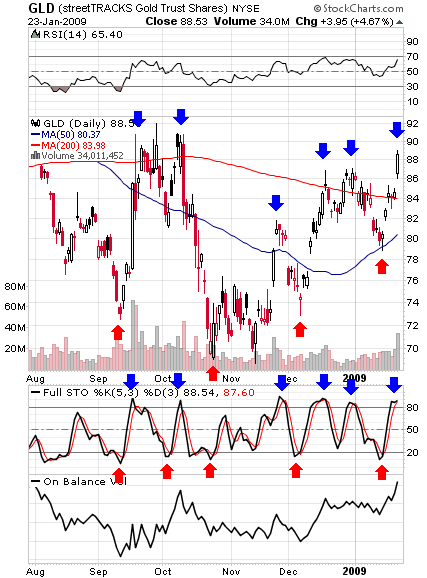 The chart I posted Sunday night details the strategy for this trade. GLD has provided an excellent reversal trade the last 11 times stochastics have hit extreme levels.