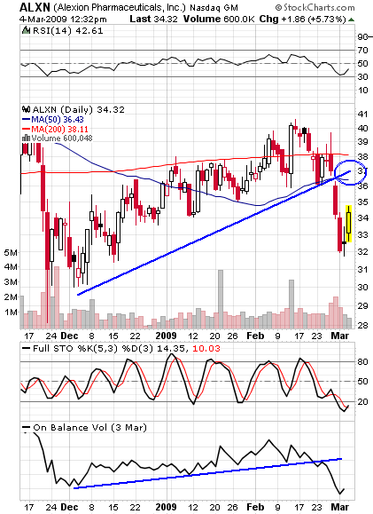 If the market gives us a multi-day bounce, I would like to use it to initiate a few short positions. I am currently watching broken stocks that are bouncing towards resistance levels. ALXN is a good example. A few days of bounce would put it near the 50 day moving average and broken trendline. This would provide a low risk, easily managed short setup.