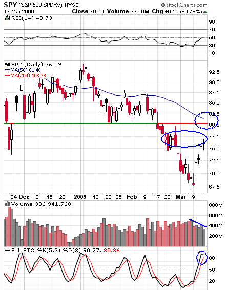 The doji candle printed Friday, which follows a bounce on low volume with overbought stochastics, leads me to believe we’ll see a pullback this week.