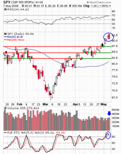 I originally was looking to enter SPY short as close to $95 as possible, but today’s “bearish engulfing” pattern leads me to believe we will pullback before that level is reached. I took a partial position today in SDS at the close (inverse short).