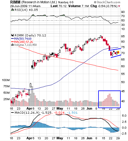 RIMM is at the top of my focus list for shorts. Notice the bear flag formation and bear flag that has formed under the 50 day moving average. The volume pattern is also showing distribution, with heavy volume on the recent drop.