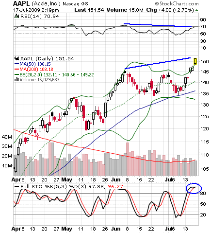 AAPL is showing a negative divergence and is extremely extended at new highs. I am short with a tight stop.