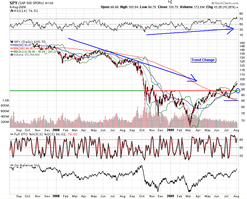 The easiest way to watch the intermediate to long term trend in the market is to simply watch the 200 day moving average. During the down trend, it sloped downward and acted as resistance. That resistance recently broke, and the slope has now turned flat and looks poised to turn up.