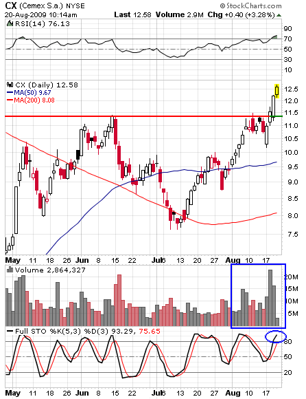 CX has a great looking chart that shows strong accumulation (volume pattern) and is breaking out to highs. The stock is extended, so I will wait for a pullback for entry.