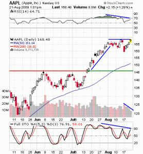 If it were any other stock, I’d take a stab at shorting AAPL right here, right now. Technically, it shows signs of losing steam and is a good “pioneer short trade.”