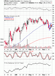 CPLA is showing a classic breakdown-pullback setup. The stock broke down below teh 50 day moving average with strong price bears, and now is in the midst of an orderly pullback to resistance.