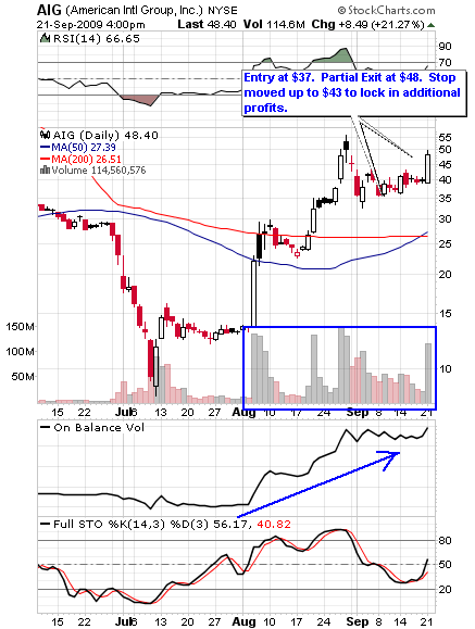 Back on September 9th, when I posted about entering AIG, it has pulled back post breakout and showed a great accumulation pattern.