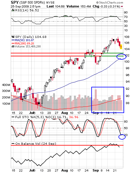 SPY is nearing converging support levels and oversold stochastic levels. A low risk opportunity may present itself near the 50 day moving average.