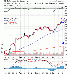 I took a short position today in SKX. The stock is extended and today’s indecisive price movement on high volume leads me to believe a pullback is in order.