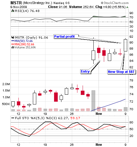 The stock continued higher today, and closed with a new breakout bar (though on relatively low volume). This provided me with an opportunity to move my stop up again and lock in more profit. I moved my new stop up to $87 to lock in a $3 gain on the remaining shares. $87 is a good level since a failure of the breakout bar would be a negative signal.
