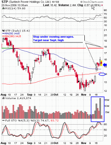 I entered STP today on weakness. The stock has shown strong strength in relation to the market, and shows a strong volulme pattern on the recent move up. My target is the September high.