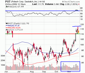 I entered POT today on pullback. My stop is at $109 and target $117, giving me a 2:1 risk ratio.