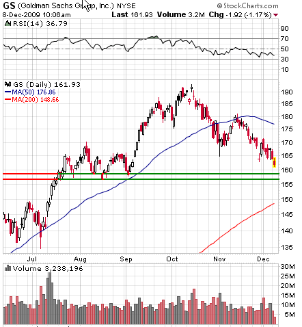 GS is oversold and nearing a strong area of support. If the stock drops a few more points today, an oversold bounce entry would provide a low risk trade.