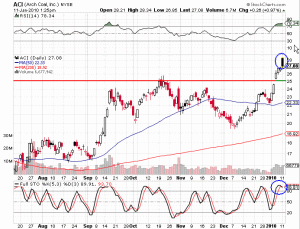 I am short ACI at $28.05 based on the extreme overbought readings in stochastic, along with extended price action. This coal setup was featured in the Trade Report last night, for short on strength at the open.