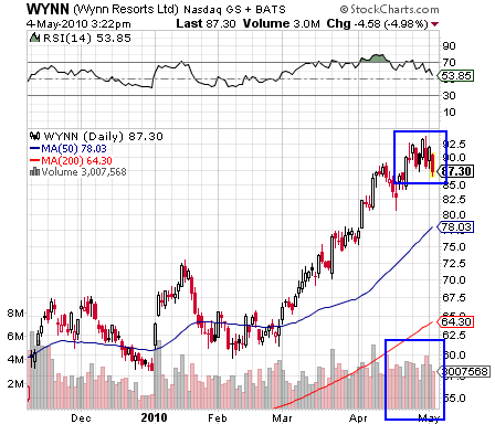 WYNN is showing signs of topping, though it is stronger than the market. Recent volatility and stronger volume to the down side make this an attractive “anticipatory short” with low risk if stopped out.