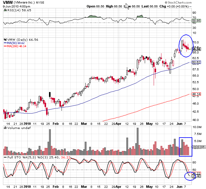 I entered VMW yesterday on a breakout-pullback setup. Note that stochastics are now oversold and price has moved back to the bottom of the breakout bar on declining volume.
