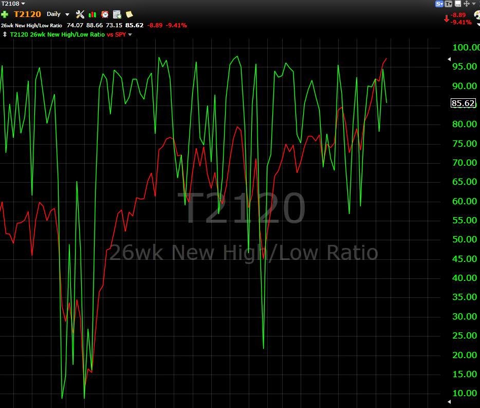 This chart is as clear as day. When Telechart’s T2120 (which measures the ratio of 26 week new highs to new lows) hits 95, it is time to short SPY. We are at 85 right now. Ten more points and we have an easy short play.