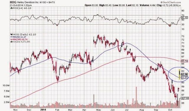 Today, HOG (Harley Davidson) posted knock out earnings, which caused price to gap up over a downtrend and the 50 day moving average. This could be the catalyst it need to test the old highs.