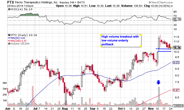 PTX is a good example of this setup. It broke out on strong volume and has now pulled back in orderly volume on low volume. This is the type of price and volume action we went to see for this setup.