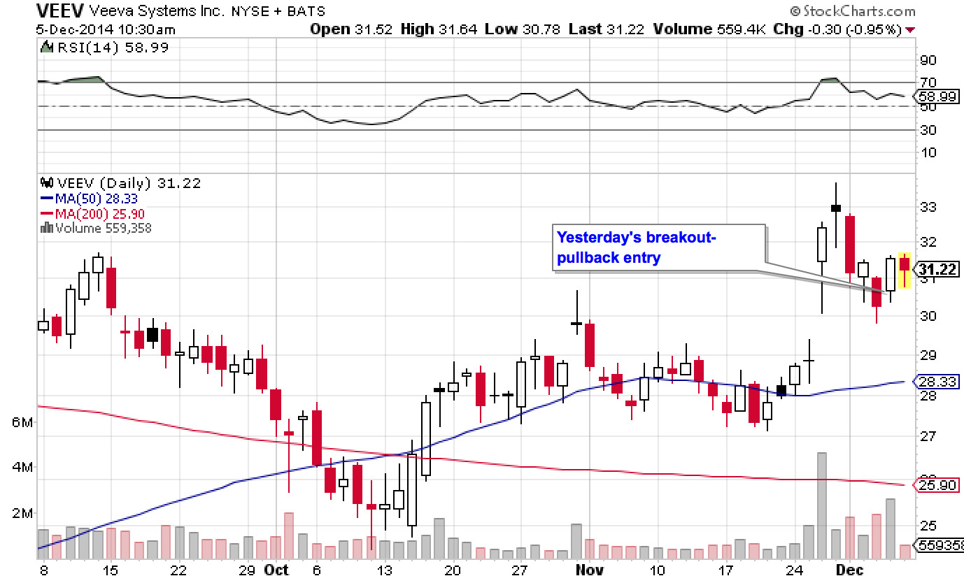 As a swing trader, one of my favorite setups is the breakout-pullback setup. Yesterday I entered VEEV as it pulled back and tested and confirmed the bottom of the breakout bar. The stop is under the breakout bar with an initial target near the recent high at $33. This gives me a 3 to 1 reward to risk ratio.