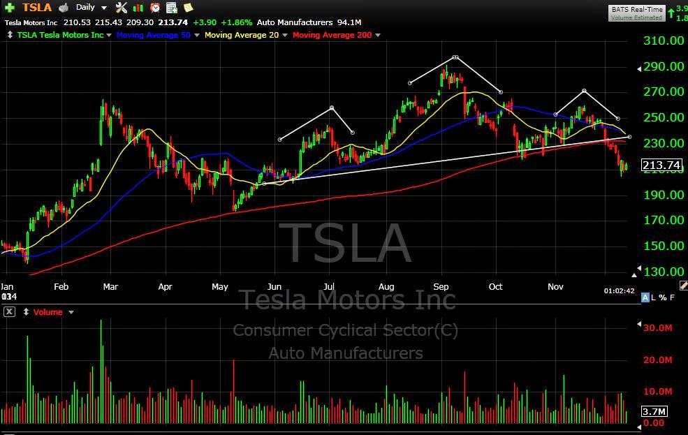 Everyone of these fallen leaders forms a topping head and shoulders pattern, followed by a trend line break and increased volatility. That is exactly what we are seeing in TSLA right now. In the chart below, take note of the classic head and shoulders pattern, along with the break of the trendline and 200 day moving average.