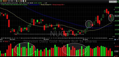 When choosing the later, it’s best to play it safe with a small position size or tight stop. Today NUGT presented both options. It pulled back down to $16.50, which got it to oversold levels, before reversing into what now looks like a positive candle pattern. This pattern is not valid until the close.