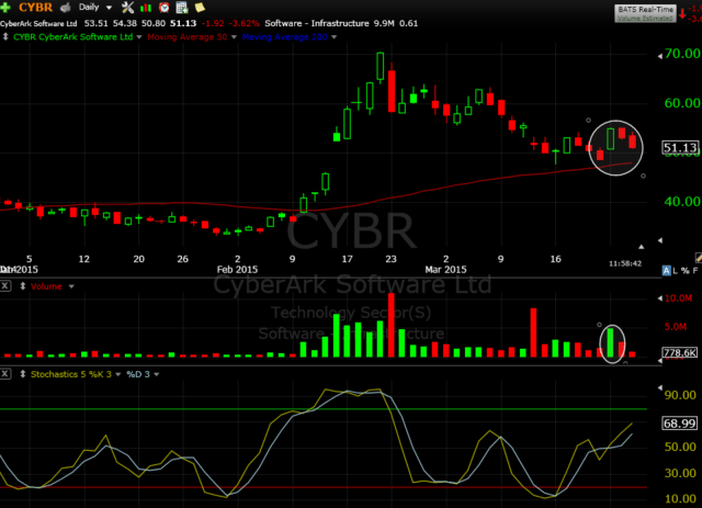 Today’s swing trade stock chart of the day is CYBR. Cyber security stocks have been on fire since early February. When stocks go parabolic like CYBR, it is often tough to find a good entry level. Now the stock has pulled back to the 50 day moving average giving us an entry that makes it easy to mange our risk.