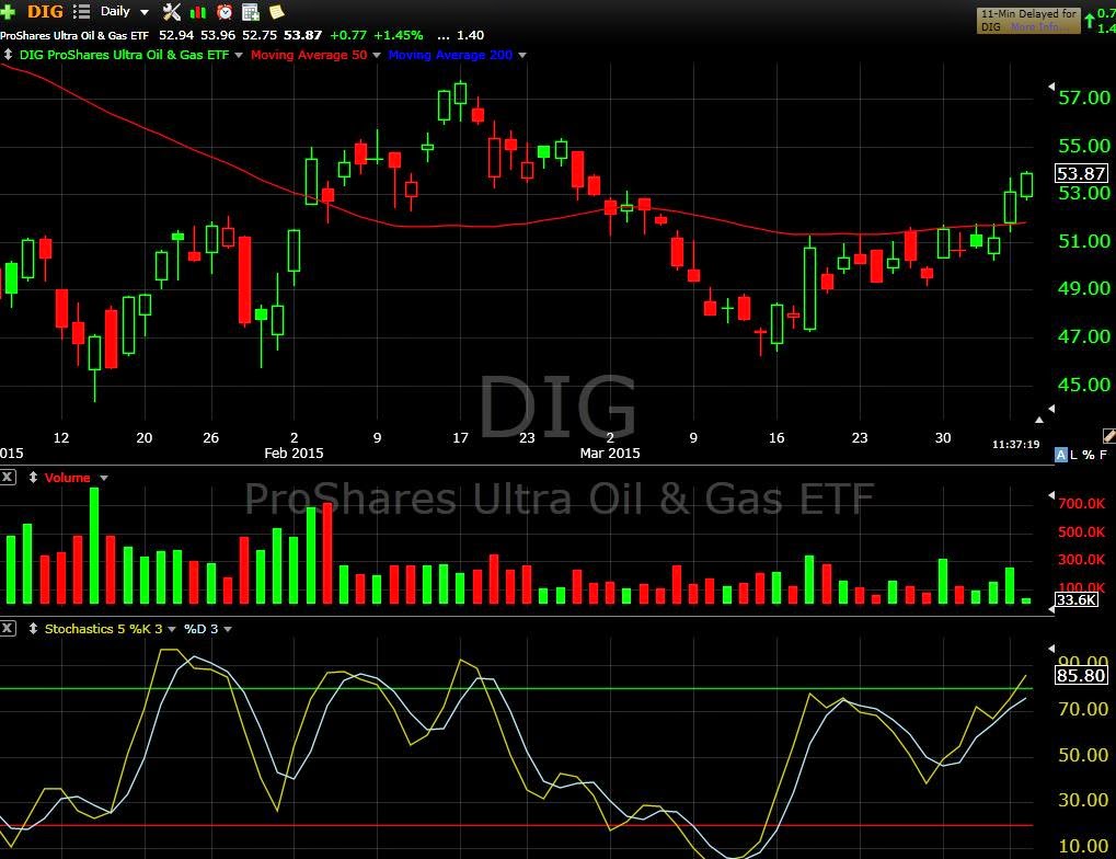 Today’s swing trade stock chart of the day is DIG.  Energy is showing positive money flow and the sector has broke out over the 50 day moving average. Here we can place a stop under the moving average with a target at the recent February pivot high at $57.
