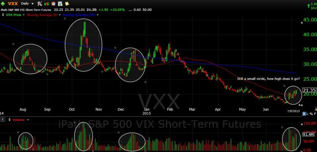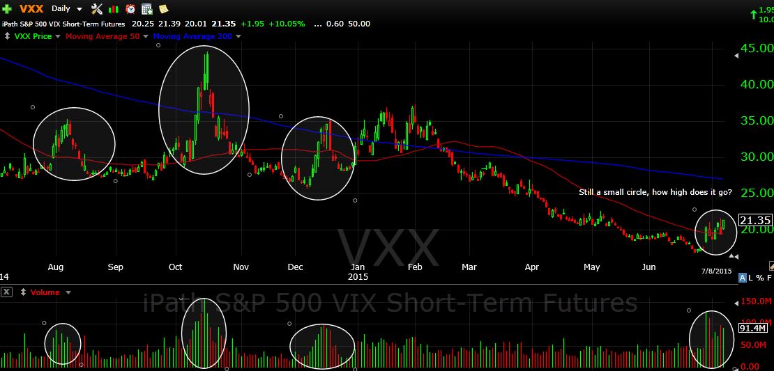 Here you can see that when volume spikes, so does VIX. We are currently in the midst of a big volume spike and VXX has ramped up from a low of $17 to $21.35. Studying recent volume spikes, it looks like we still have some room to run.