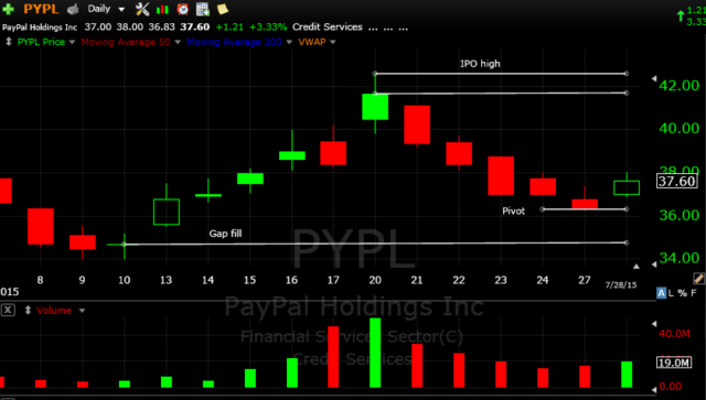 PYPL has formed a few key levels that we can now trade off. First are the IPO lows and highs, which form an 8 point range between $34 and $42. Watch for either a pullback to the low or breakout of the highs for a good, low risk entry. The other two key levels are the gap fill and pivot areas annotated on the chart below.