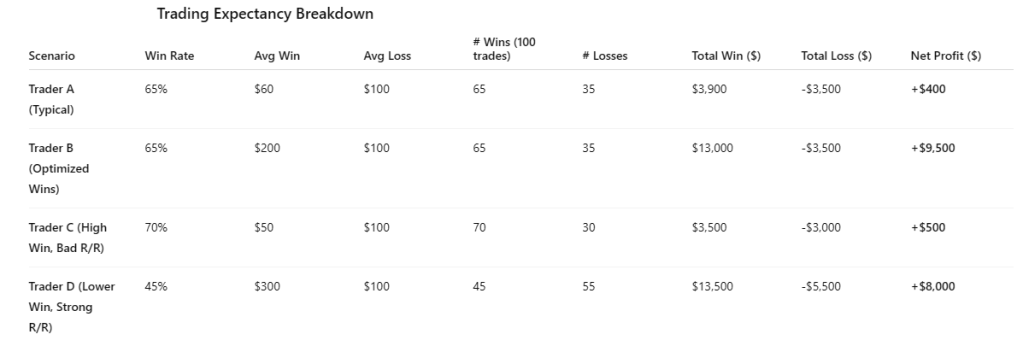 The issue is that your win rate is lying to you. It is giving you a false sense of competence while quietly sabotaging your long-term results. If you risk $100 per trade and lose 35 times, you are down $3,500, which is expected. But if your 65 winning trades only average $60 each because you are constantly taking profits too early, you end up with $3,900 in gains, leaving you with a net profit of just $400 after one hundred trades. That is barely anything, and it does not account for commissions, slippage, or inevitable mistakes. Now imagine nothing else changes except your ability to hold winners, and instead of $60 your average win becomes $200. Suddenly those same 65 wins produce $13,000 against $3,500 in losses, and now you are up $9,500. Same trader, same setups, same win rate, but a completely different outcome simply because you learned how to win.
